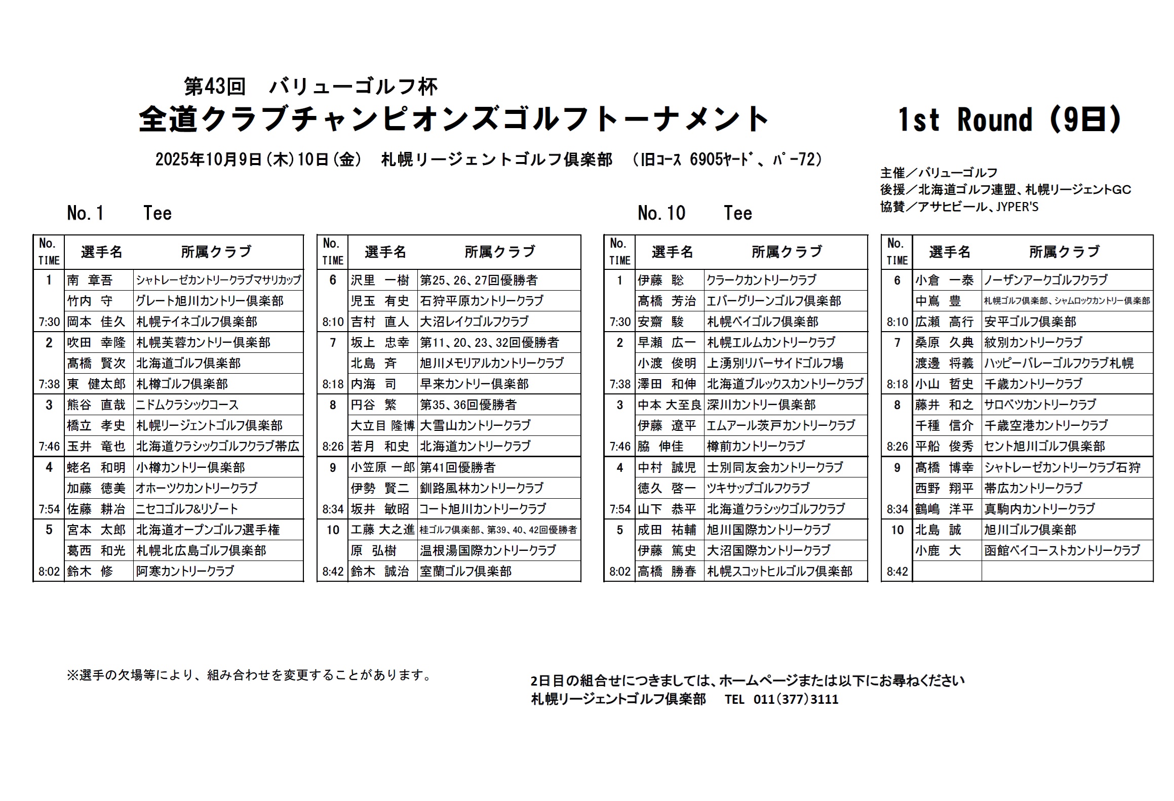 第43回全道クラブチャンピオンズゴルフトーナメント初日組合せ