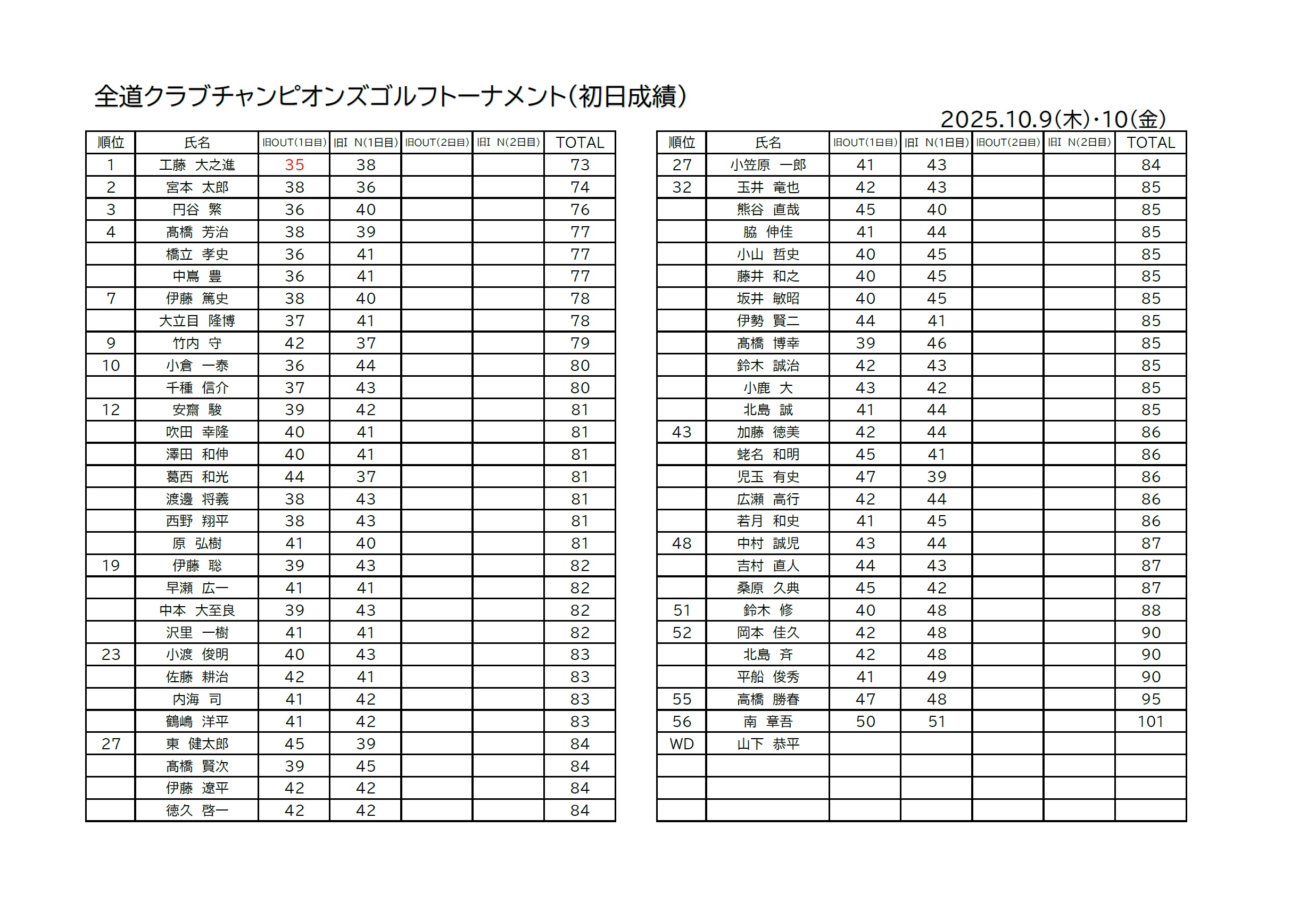第43回全道クラブチャンピオンズゴルフトーナメント初日成績および組合せ