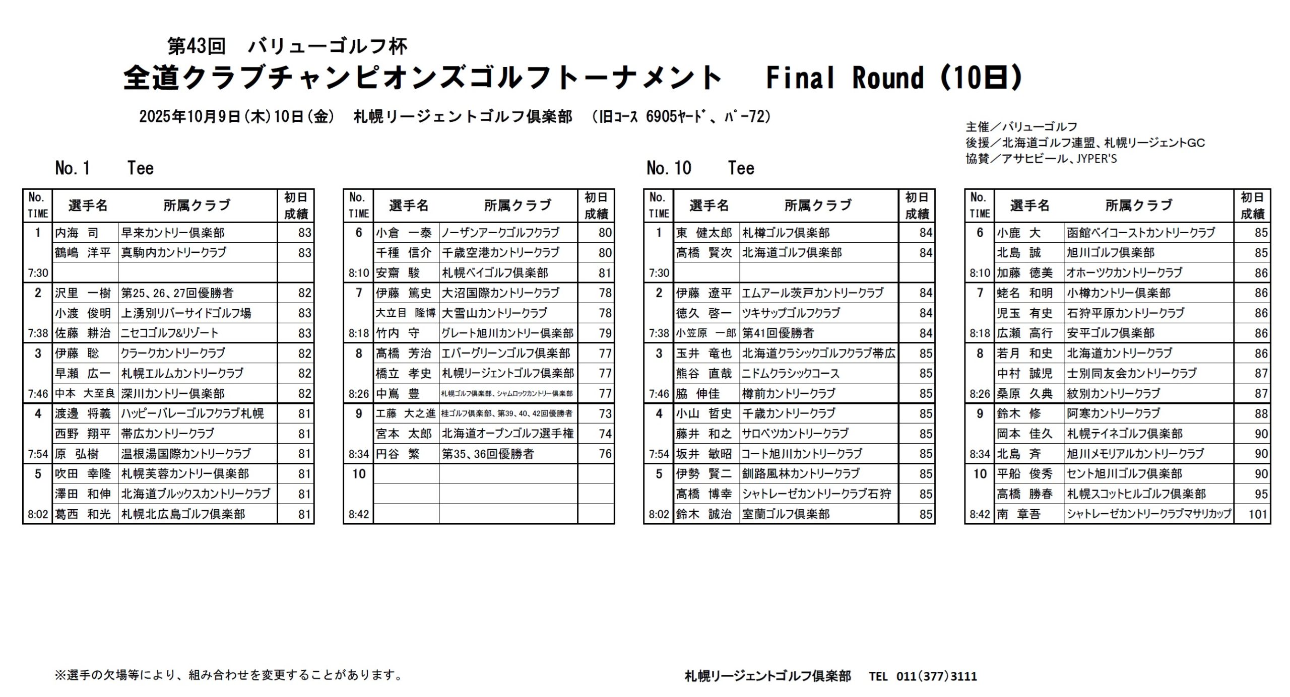 • 第43回全道クラブチャンピオンズゴルフトーナメント初日組合せ